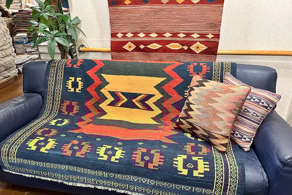 キリムも遊牧民たちが織る平織りの敷物です。 幾何学のモチーフはさまざまな意味を持ち、独創的な色やデザインは、その芸術性の高さでも注目されています。